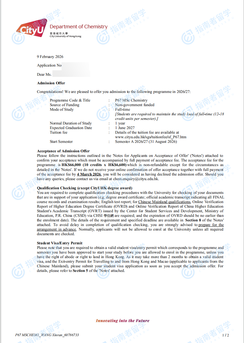 香港城市大学化学理学硕士研究生offer一枚