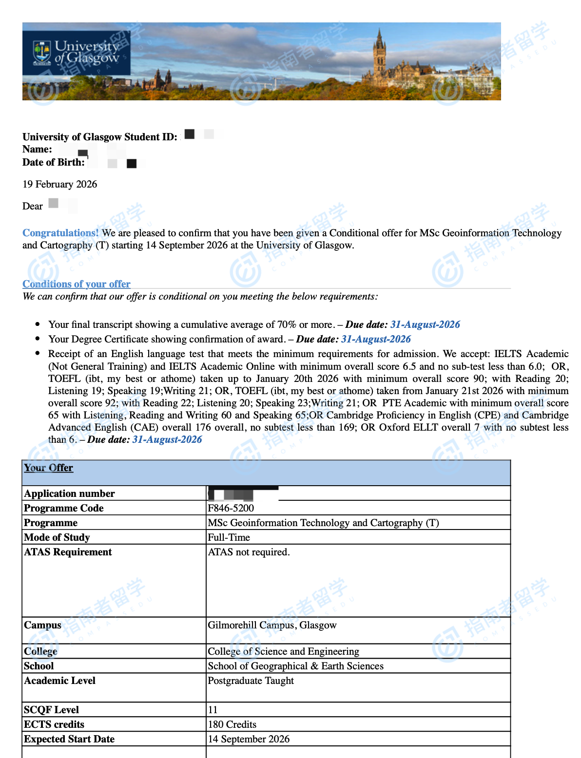 格拉斯哥大学地理信息技术与制图学理学硕士研究生offer一枚