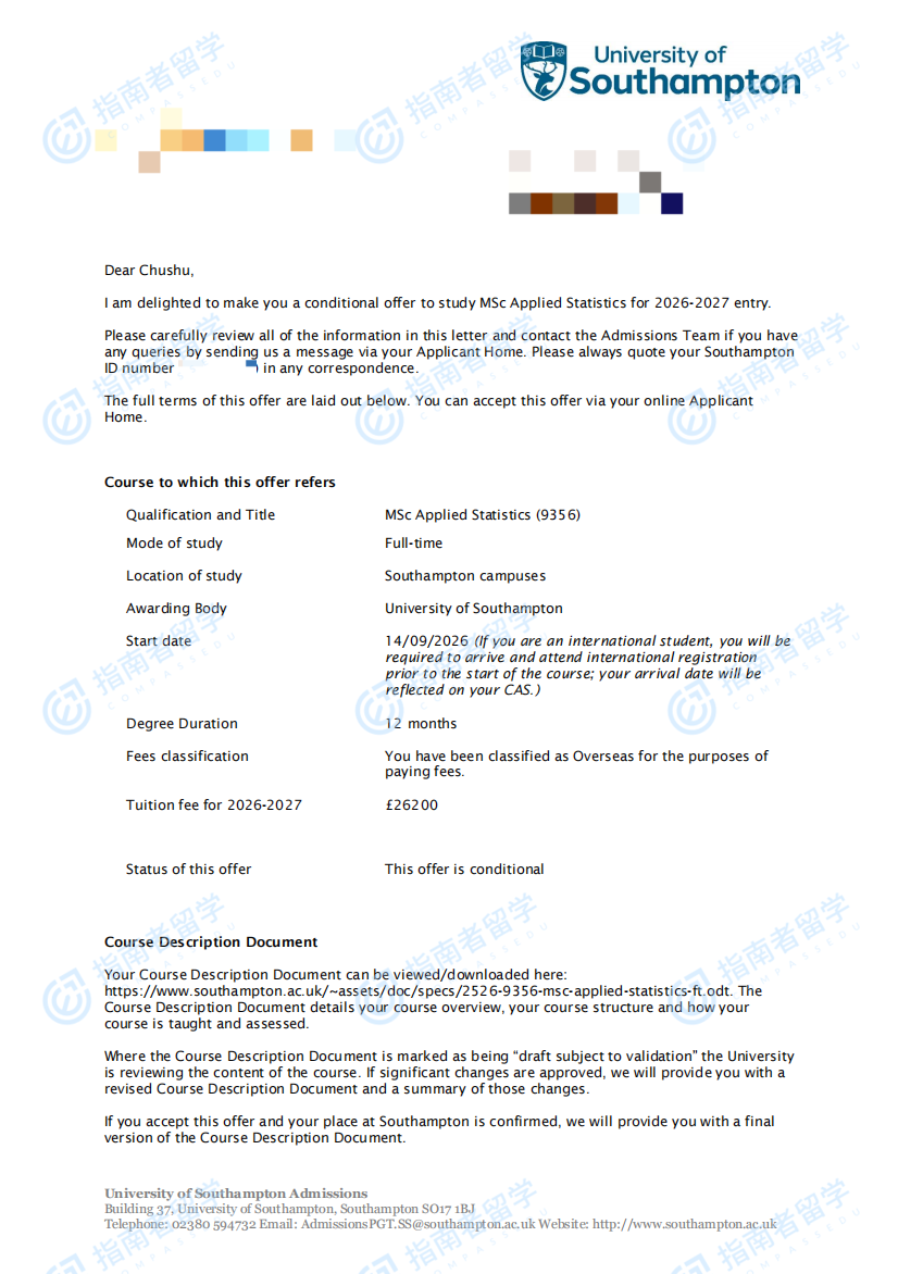 南安普顿大学应用统计学理学硕士研究生offer一枚