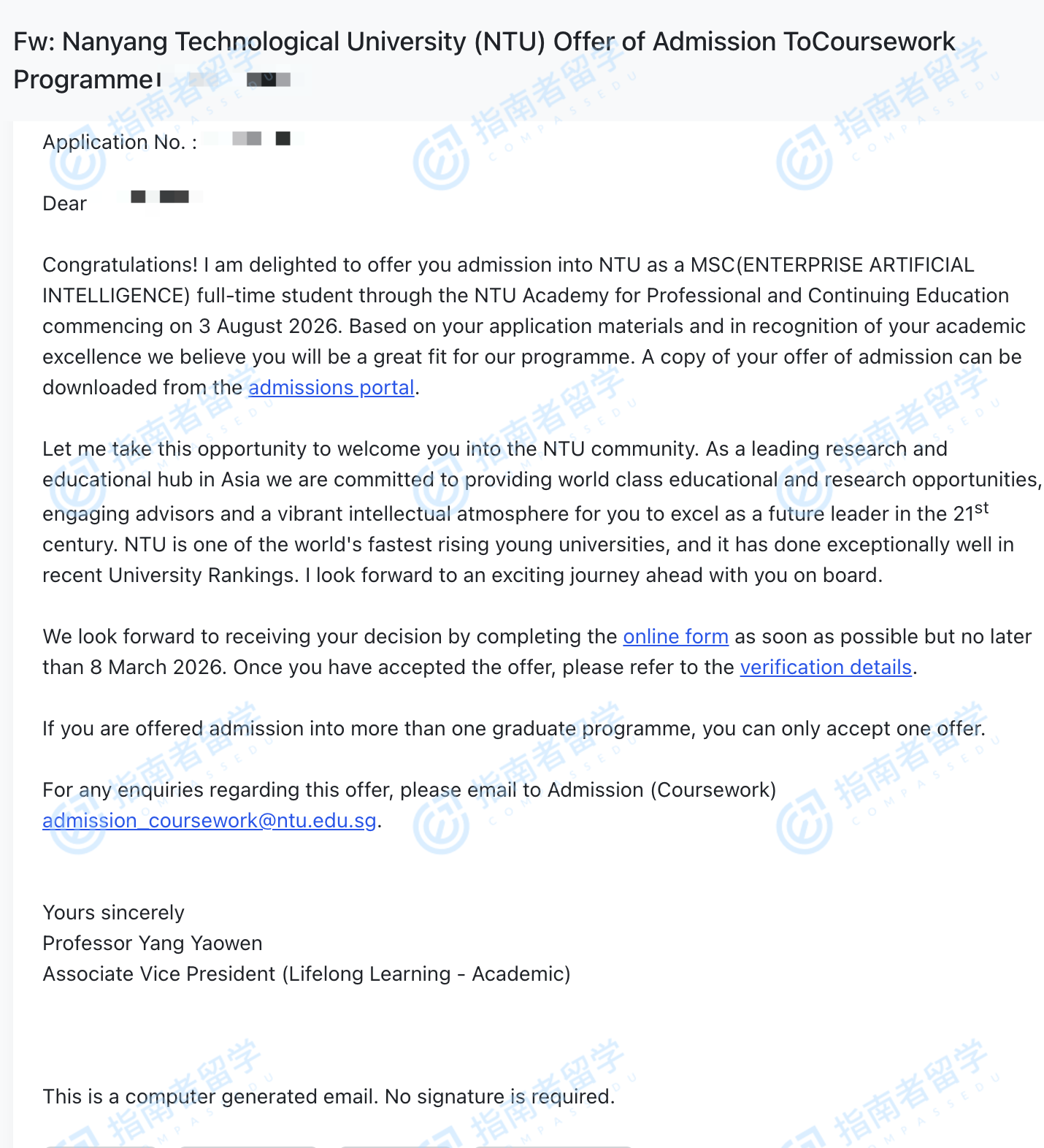 南洋理工大学企业人工智能理学硕士研究生offer一枚