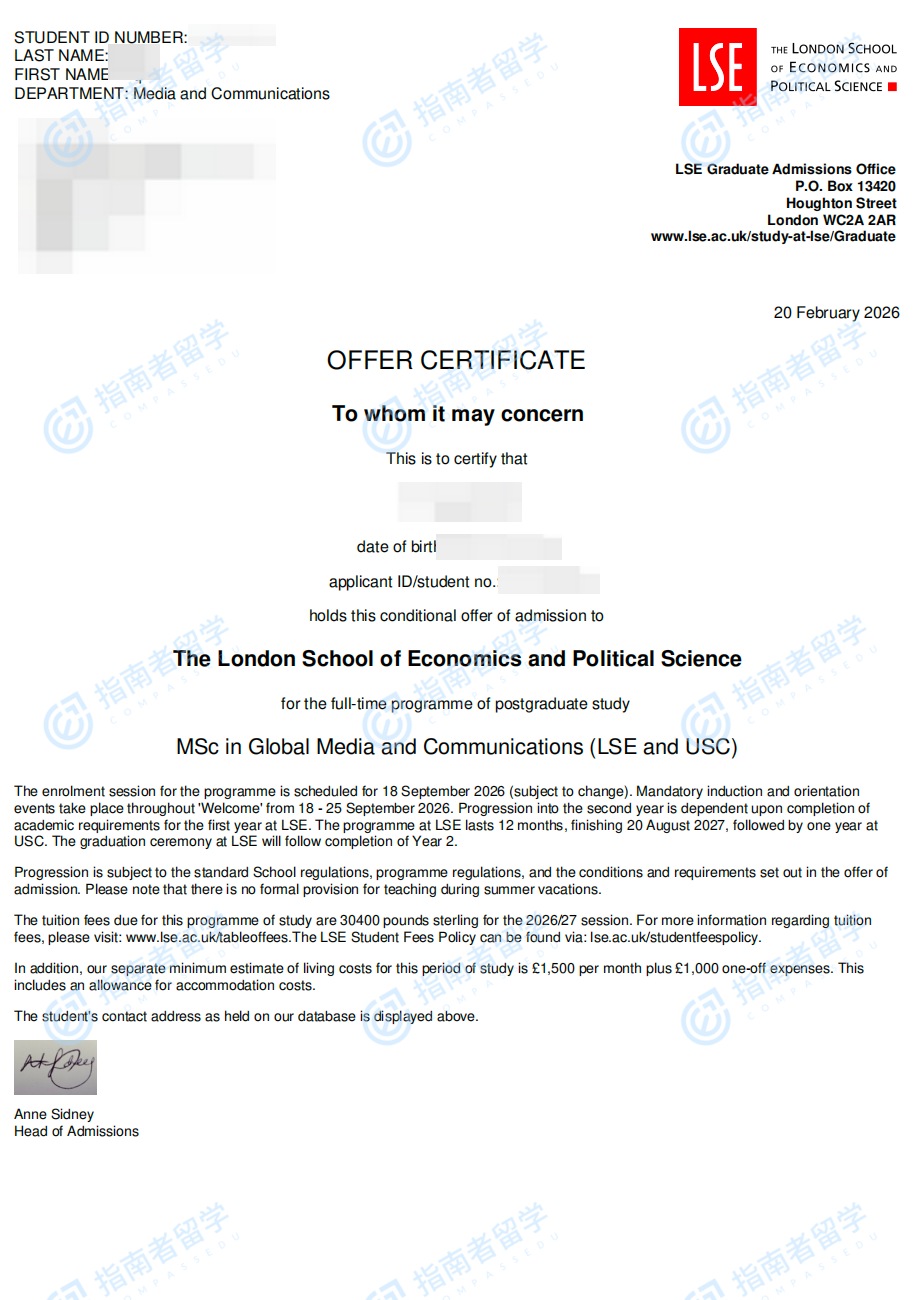 伦敦政治经济学院全球媒体与传播理学硕士双学位(伦敦政治经济学院-南加利福尼亚大学)研究生offer一枚