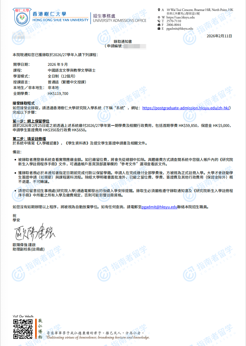 香港树仁大学中国语言文学与教学文学硕士研究生offer一枚