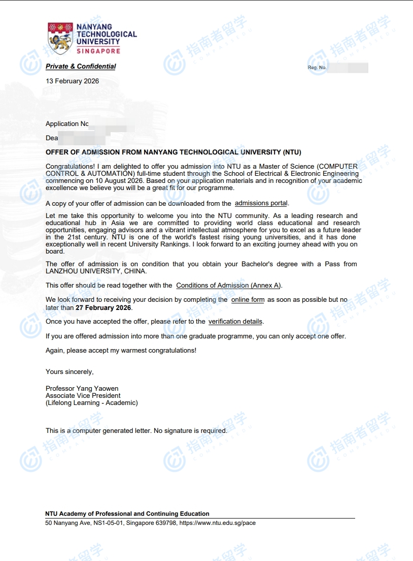 南洋理工大学计算机控制与自动化理学硕士研究生offer一枚