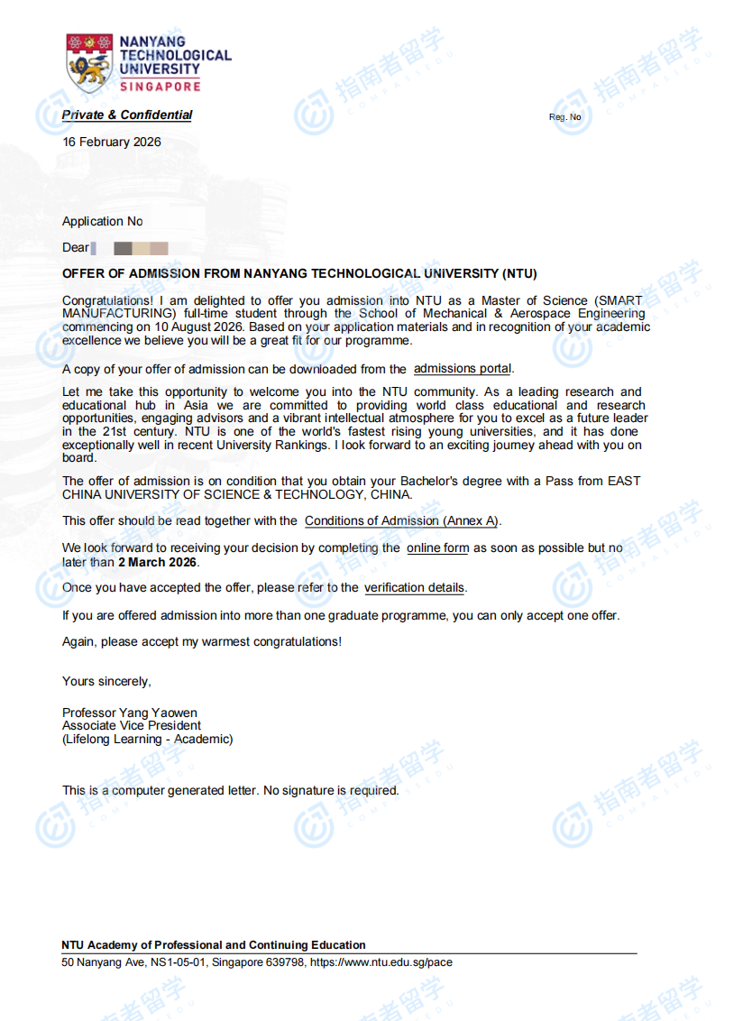 南洋理工大学智能制造理学硕士研究生offer一枚