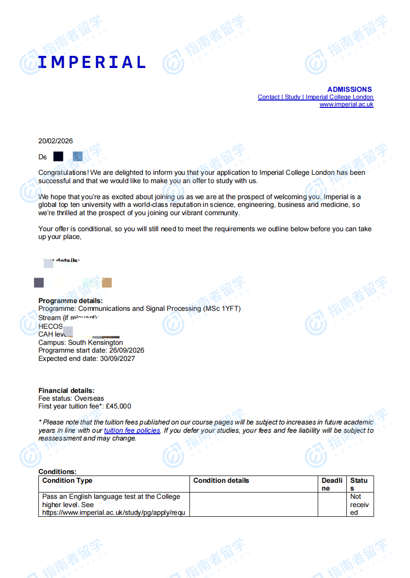 帝国理工学院通信与信号处理理学硕士研究生offer一枚