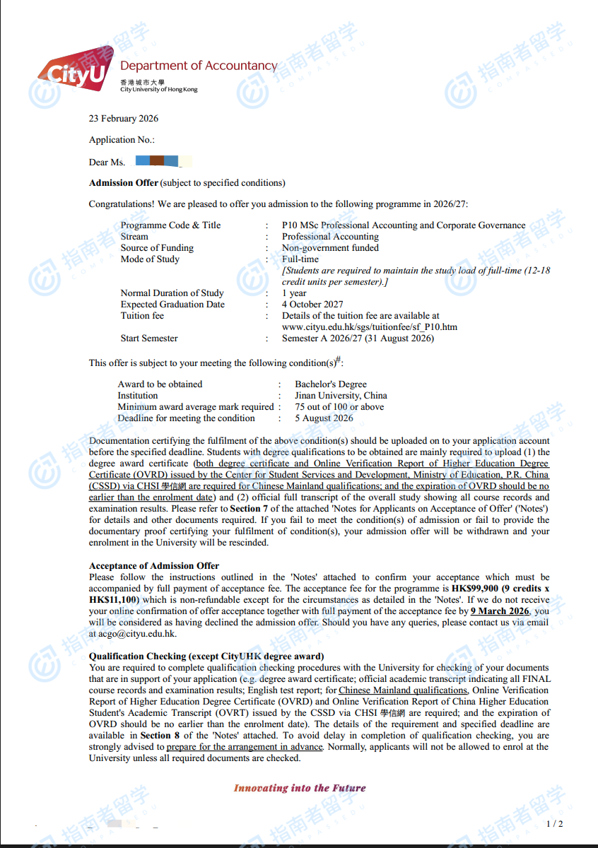香港城市大学专业会计与企业管治理学硕士研究生offer一枚