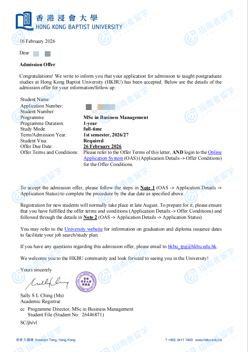 香港浸会大学商业管理理学硕士研究生offer一枚