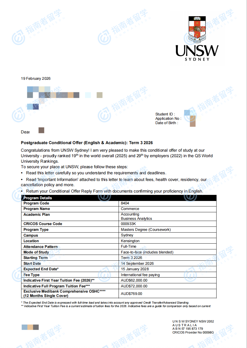 新南威尔士大学商学硕士研究生offer一枚