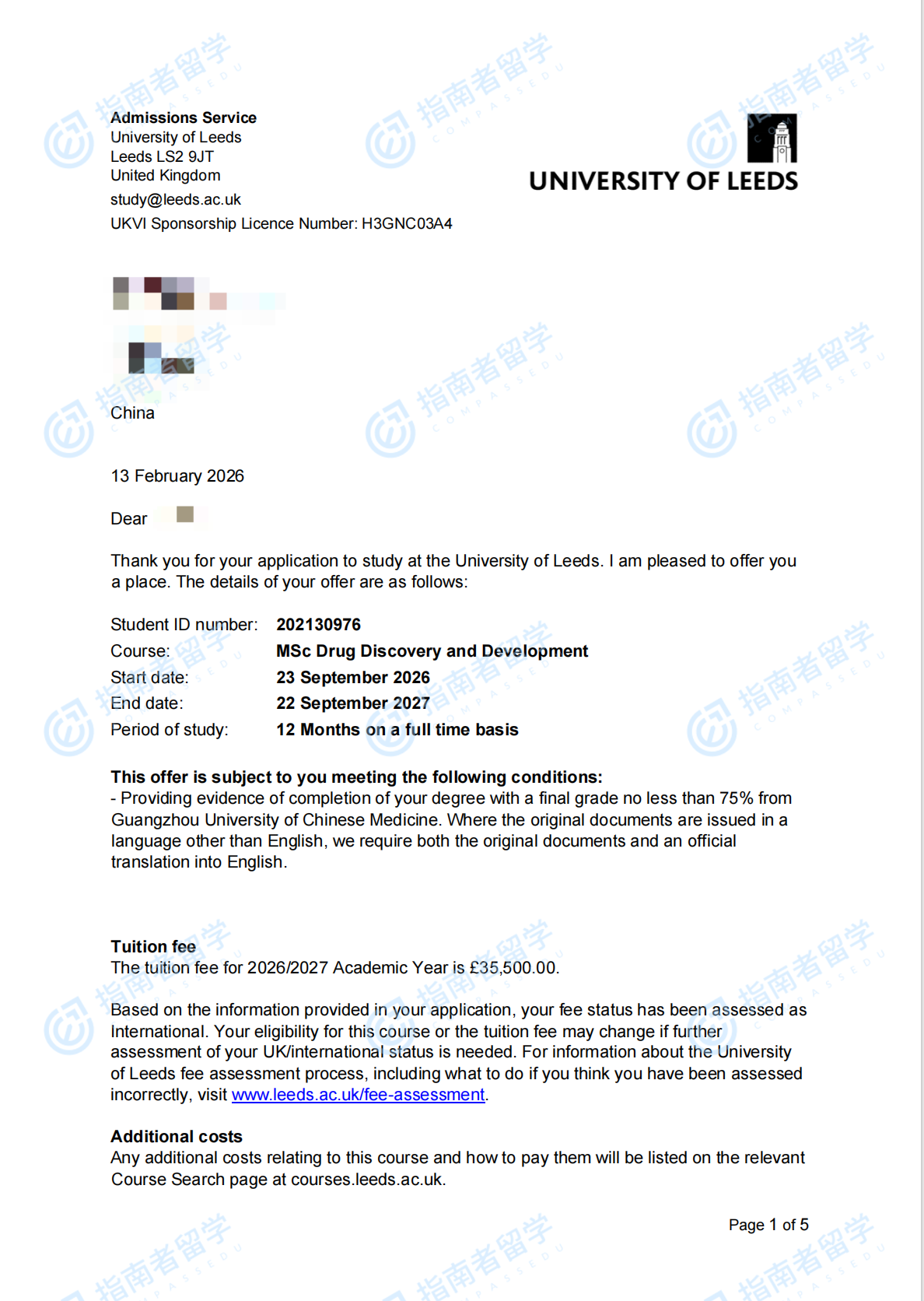 利兹大学药物发现与开发理学硕士研究生offer一枚