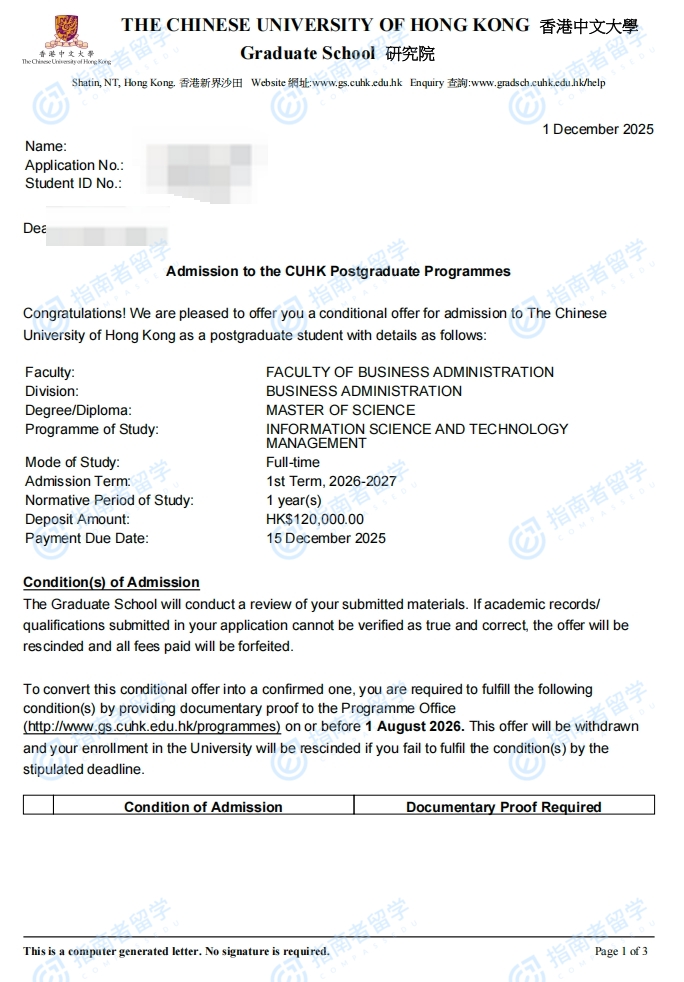 香港中文大学信息科学与技术管理理学硕士研究生offer一枚
