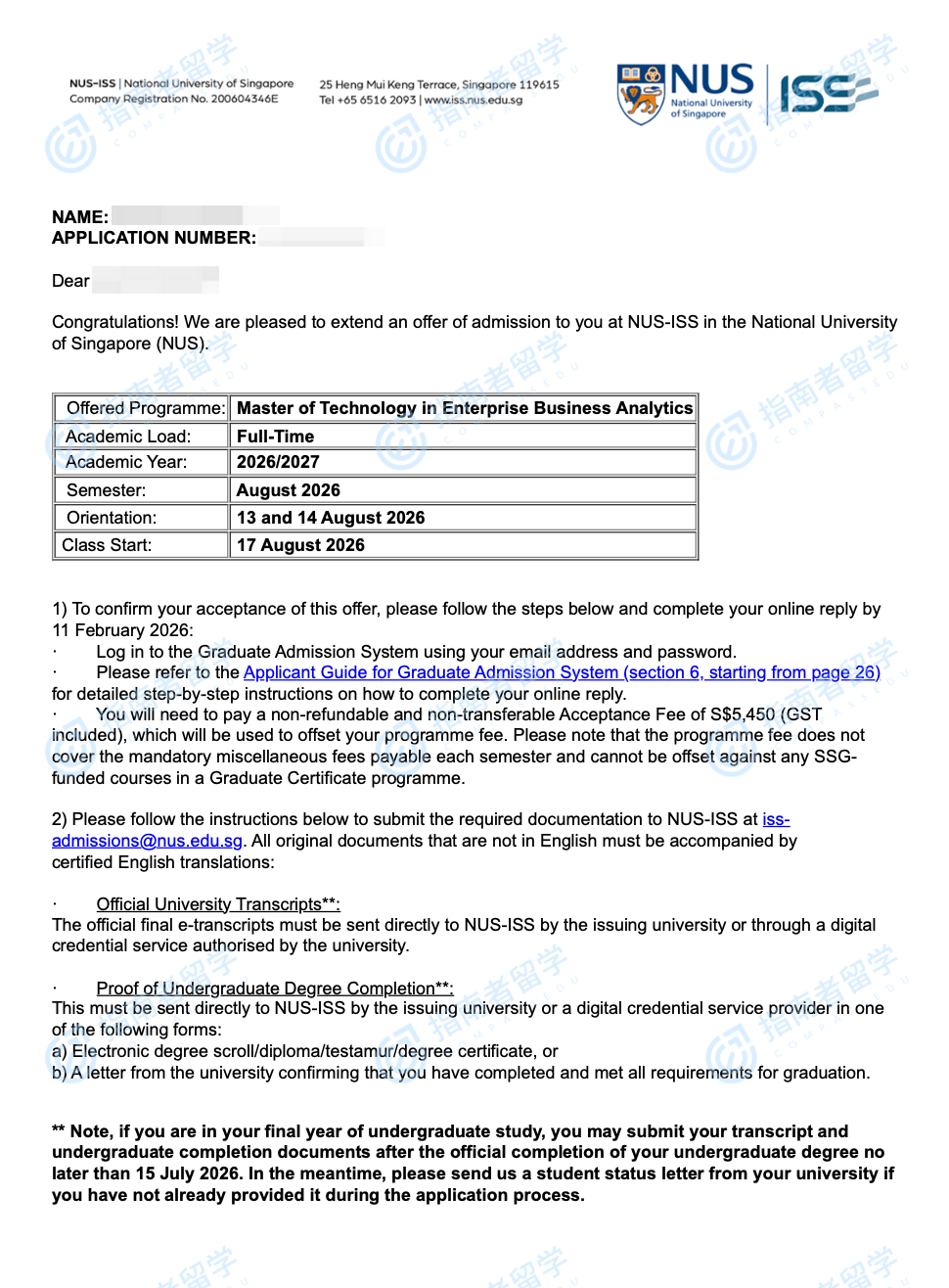 新加坡国立大学企业商业分析科技硕士研究生offer一枚
